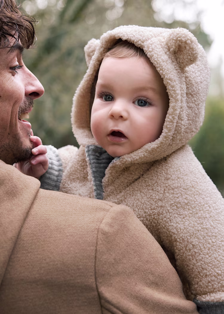 Abrigo de manga ranglán para recién nacido. Capucha con detalles de pelo. Cierre central delantero con cremallera. Suave forro interior de poliéster. Bolsillos funcionales en la parte delantera. Se trata de un artículo de diseño unisex de gran versatilidad por la neutralidad de sus tonos y su forma. Este modelo presenta un diseño reversible.
