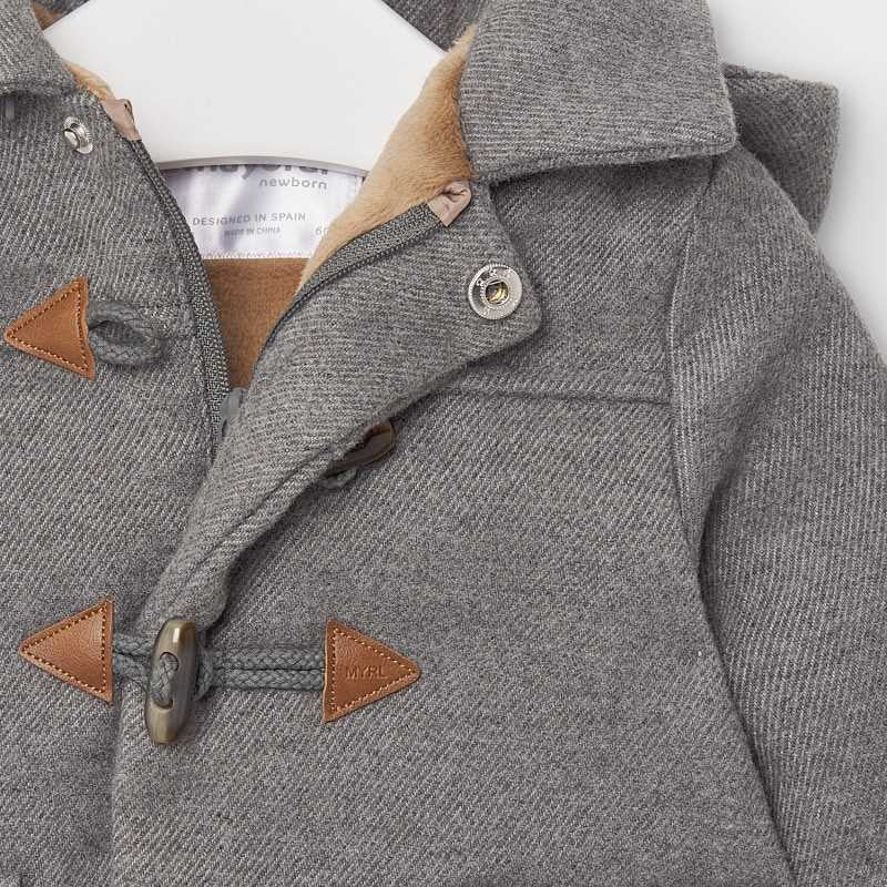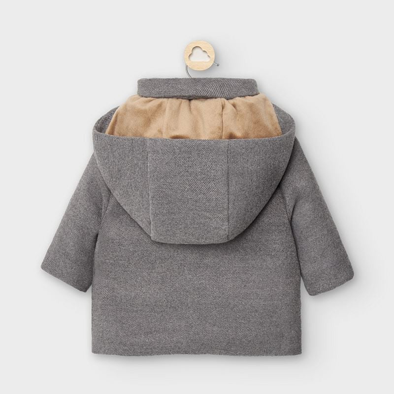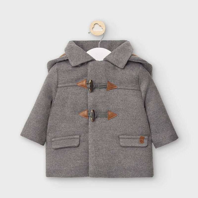 Abrigo tipo trenka de manga larga para recién nacido niño de 0 a 18 meses. Cuello redondo. Cuello con capucha desmontable. Cierre con cremallera delantera y alamares. Cálido tejido de paño resistente y clásico. Bolsillos funcionales en la parte delantera.