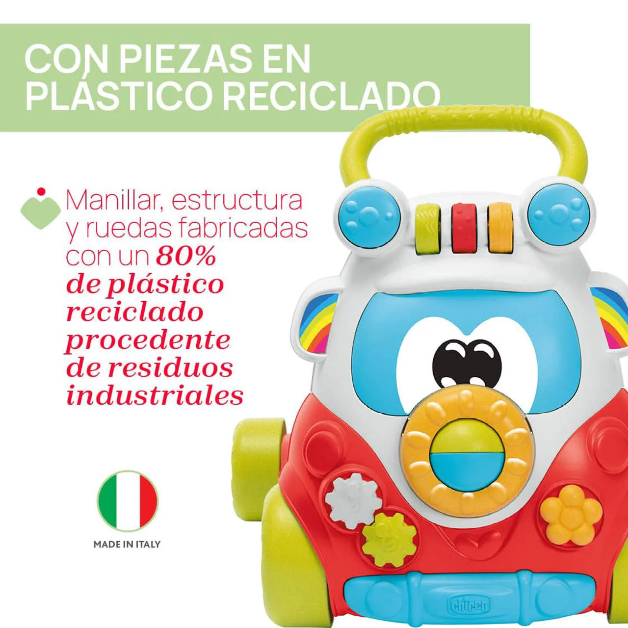 - PRIMEROS PASOS: Un divertido andador de actividades 2 en 1 con estilo hippie fabricado en plástico reciclado.