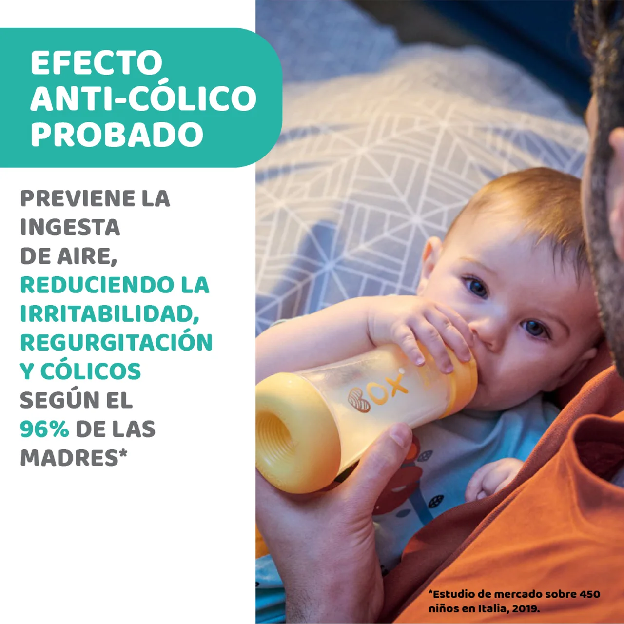 - Efecto anticólico probado: La combinación de la Membrana Equilibrium con la tetina Physio ayuda a prevenir la ingestión de aire, lo que reduce la irritabilidad, la regurgitación y los cólicos según el 96 %* de las madres. * Prueba de consumo en 450 bebés en Italia, 2019.