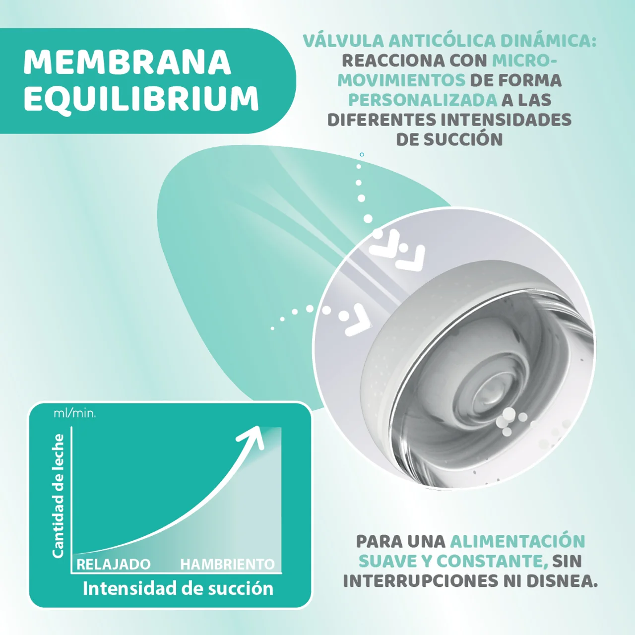 - Membrana Equilibrium: Esta membrana de la parte inferior del biberón es una válvula anticólicos flexible y dinámica que permite la entrada de aire sin mezclarse con la leche, evitando cualquier vacío e interrupciones durante las tomas.