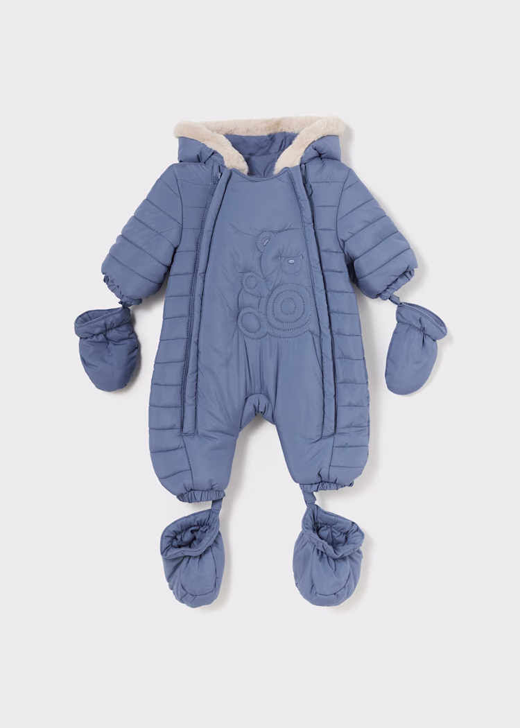 Buzo de manga larga para recién nacido. Cuello con capucha. Cierre central delantero con cremallera. Original exterior confeccionado con microfibra.
