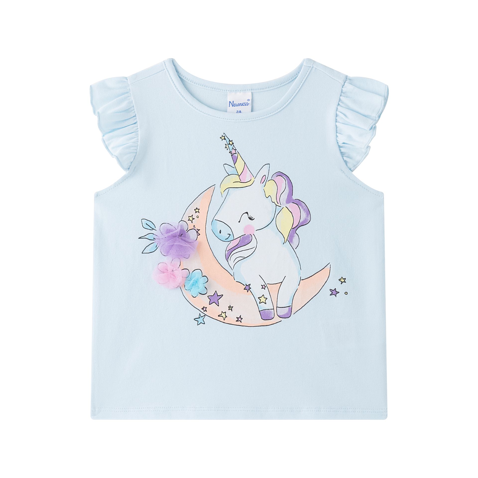 Una camiseta delicada y con mucho encanto para las pequeñas con estilo. En azul claro, cuenta con mangas con volantes a tono que aportan un toque femenino y alegre, y un bonito dibujo en la parte delantera que la hace aún más especial. El cierre con botón en la parte trasera facilita el vestir diario, aportando comodidad sin perder elegancia. Ideal para combinar con shorts, faldas o pantalones en días soleados y momentos especiales.
