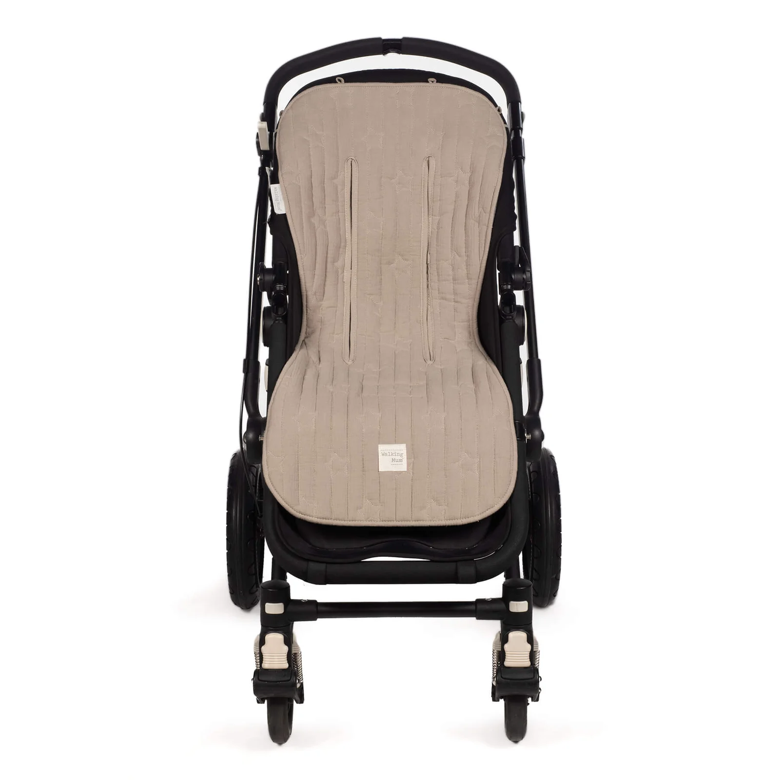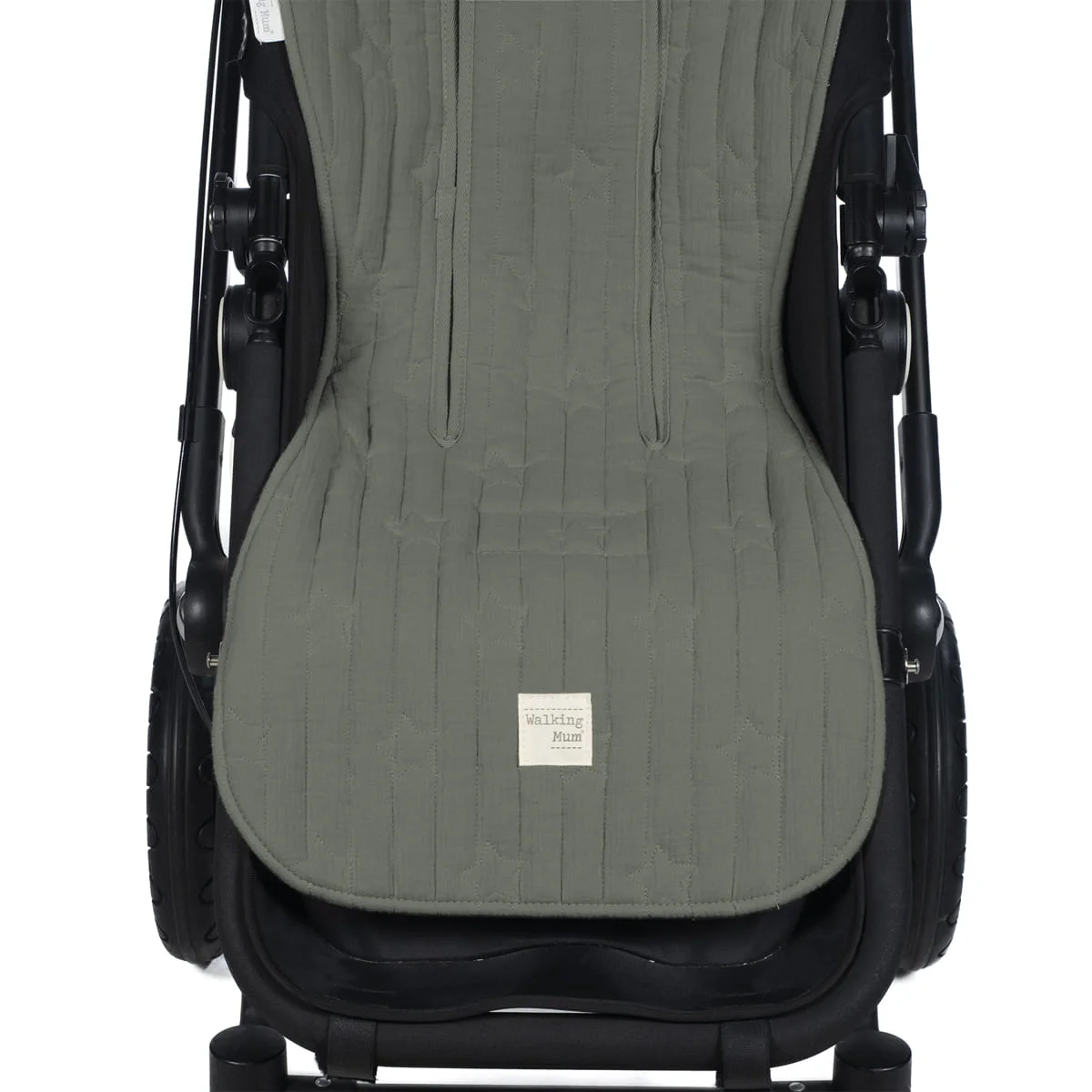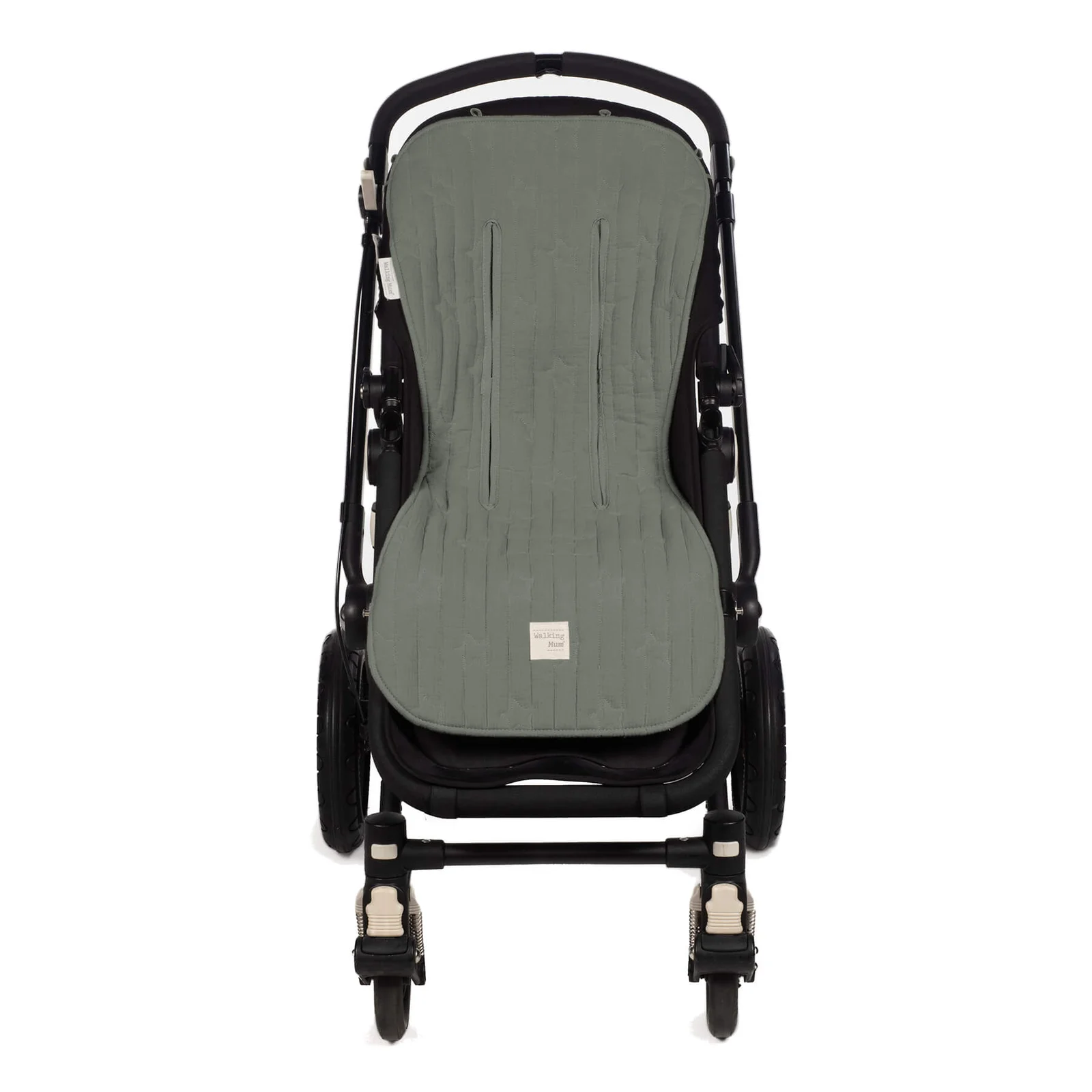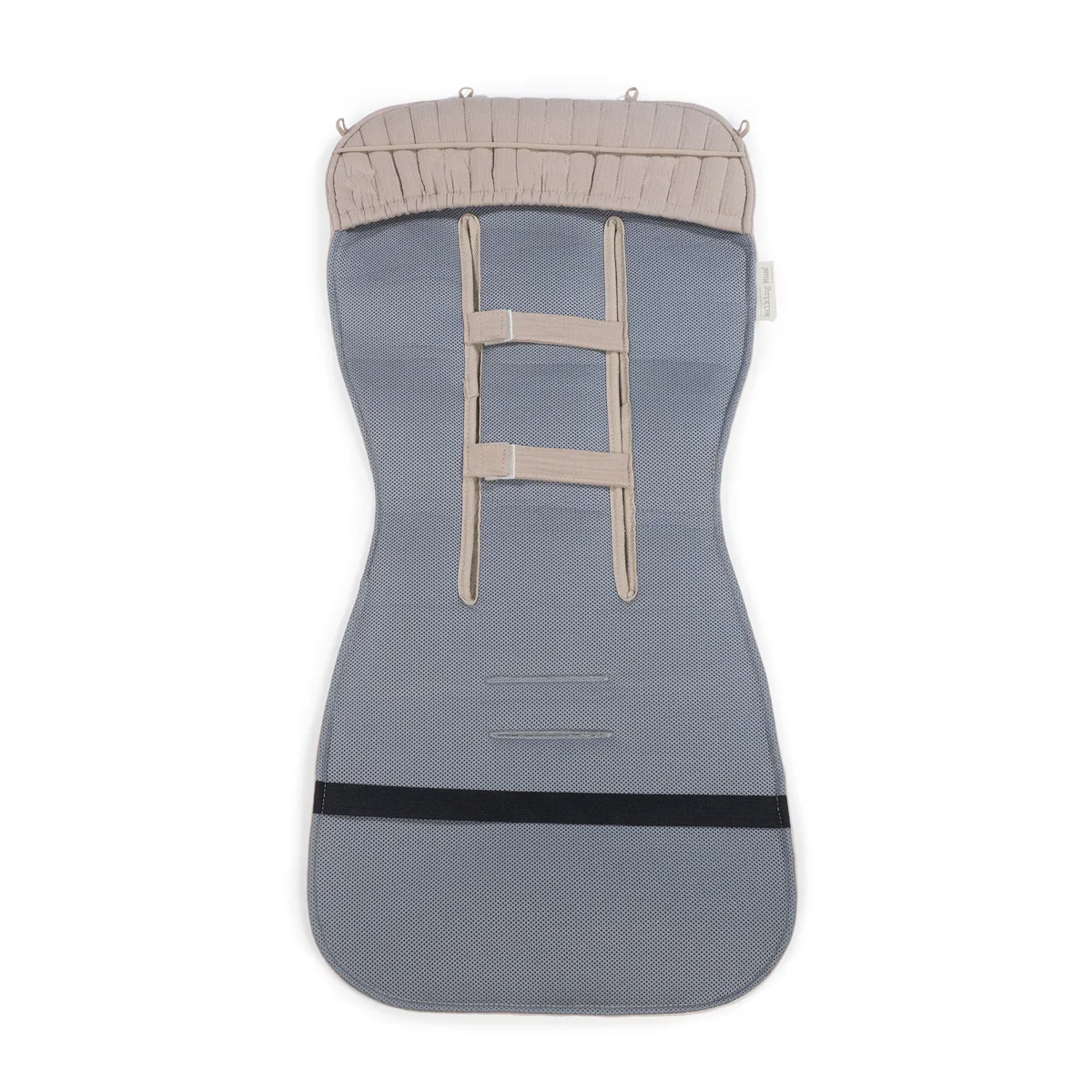 La colchoneta para silla de paseo Caetana con estrellas bordadas está fabricada con una suave muselina 100% algodón. Está elaborada con un material transpirable que ayuda a prevenir la sudoración excesiva del bebé y protege la sillita haciendo el paseo más confortable.