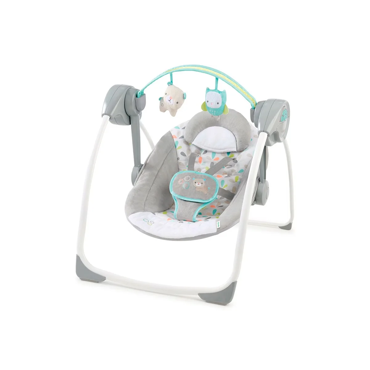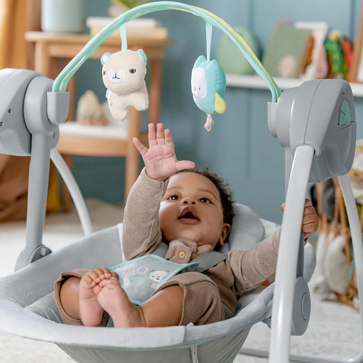 - Este Columpio ligero está lleno de características como 2 posiciones de inclinación, una Barra de juguetes con 2 juguetes de peluche que se retira para colocar y sacar al bebé, así como una tecnología superior que lleva la relajación del bebé a otro nivel.