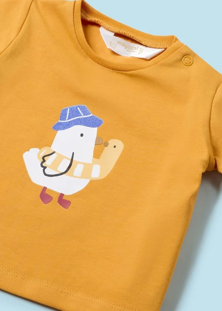 Camiseta de manga corta para recién nacido. Cuello redondo. Botón a presión en el hombro para facilitar la puesta de la prenda. Diseño estampado.