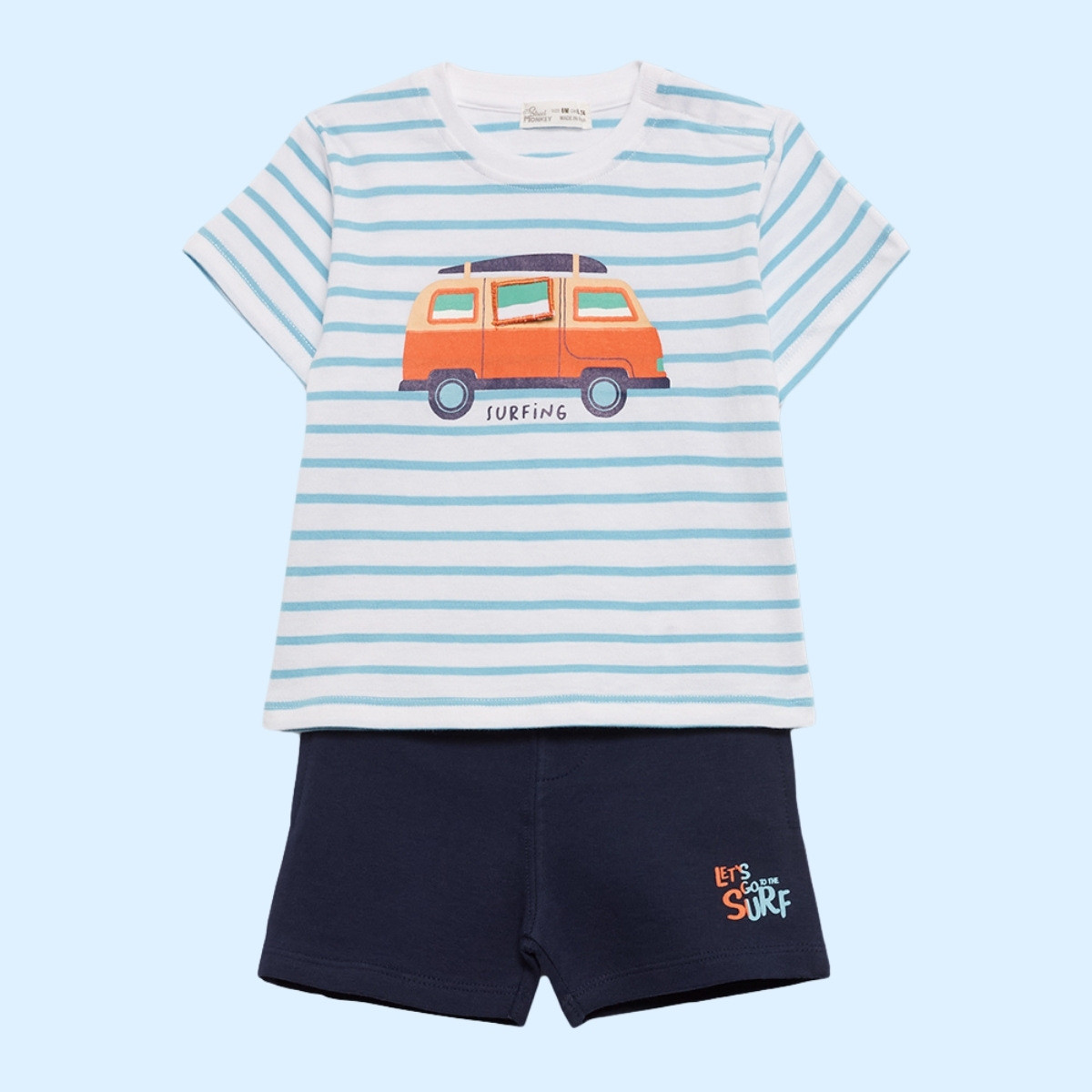 Un conjunto lleno de onda para los días más soleados. Confeccionado en 100% algodón suave, este look rayado está diseñado para ofrecer comodidad y frescura mientras tu peque disfruta del verano. Con un estilo surfero y divertido, es perfecto para la playa, vacaciones o una tarde de juegos bajo el sol. Fabricado en España con mimo, resiste los lavados sin perder color ni forma, acompañando cada mini aventura con estilo.