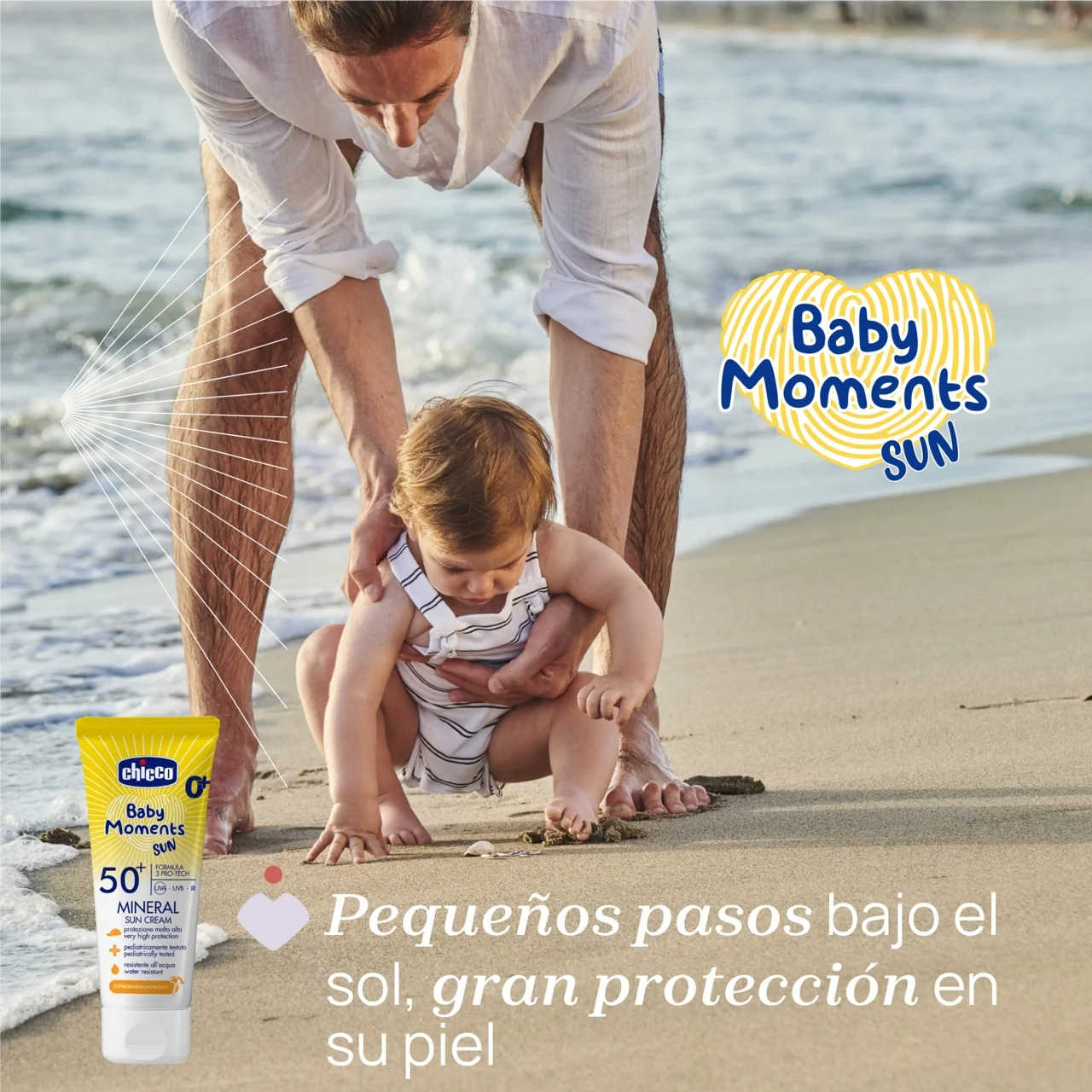 Los protectores solares para niños deben garantizar una protección alta o muy alta contra los rayos UVB. El índice de protección UVB viene dado por el SPF (Factor de Protección Solar) que, para los niños, debe ser de 50 o 50+. Todas las fórmulas de sol Chicco Baby Moments SUN tienen SFP50+.ç