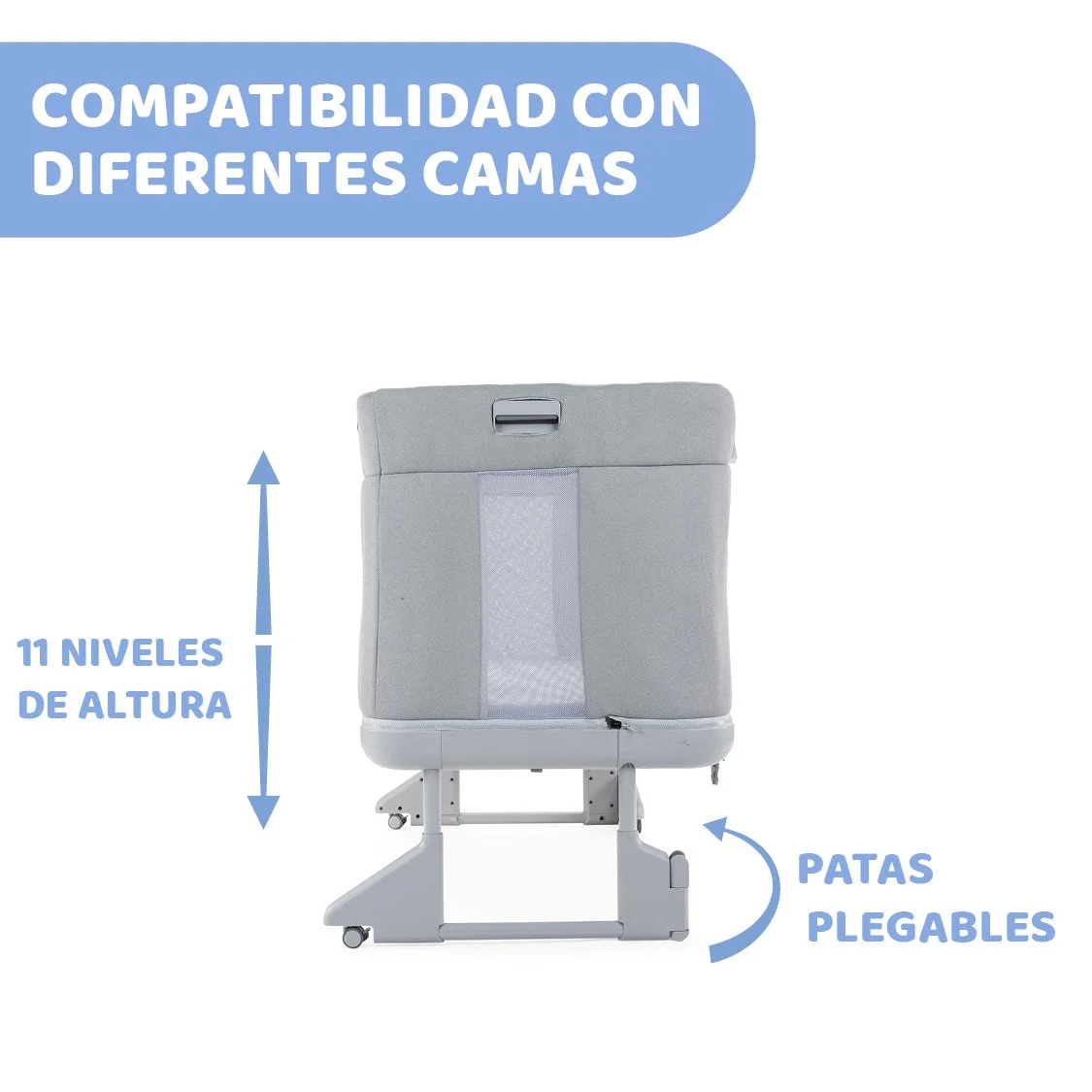 - Gracias a sus 11 posiciones de altura y las ruedas retráctiles se puede acoplar fácilmente a cualquier cama como colecho para favorecer el descanso y la lactancia durante la noche. ¡incluso camas canapé!