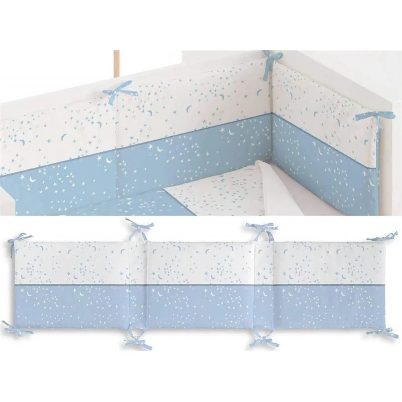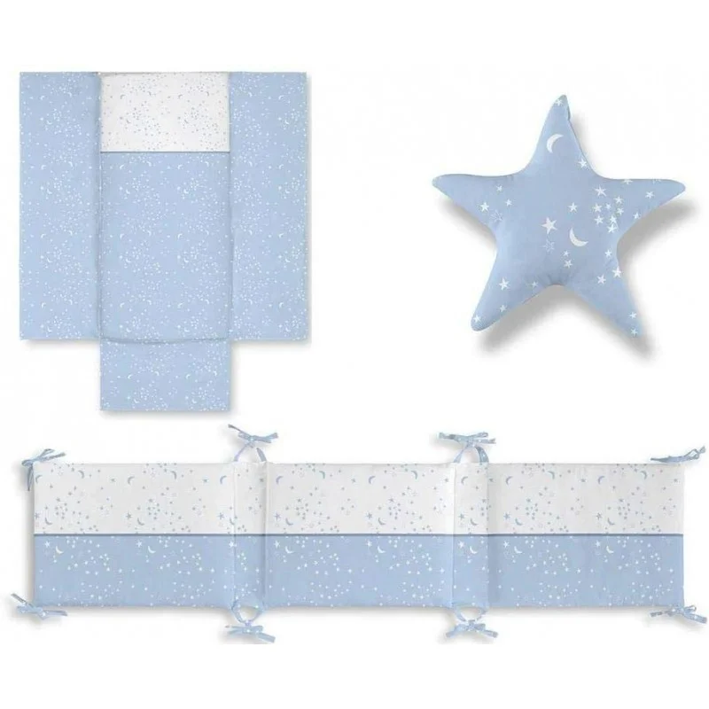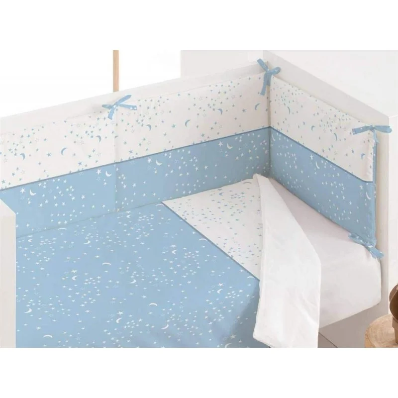 Nuevo modelo ESTRELLAS de la marca CHIC de BIMBI DREAMS, incluye edredón desenfundable y protector con tejido de algodón 90 % y 10 % de poliéster. Con tonos pasteles, celeste y con estrellas impresos.