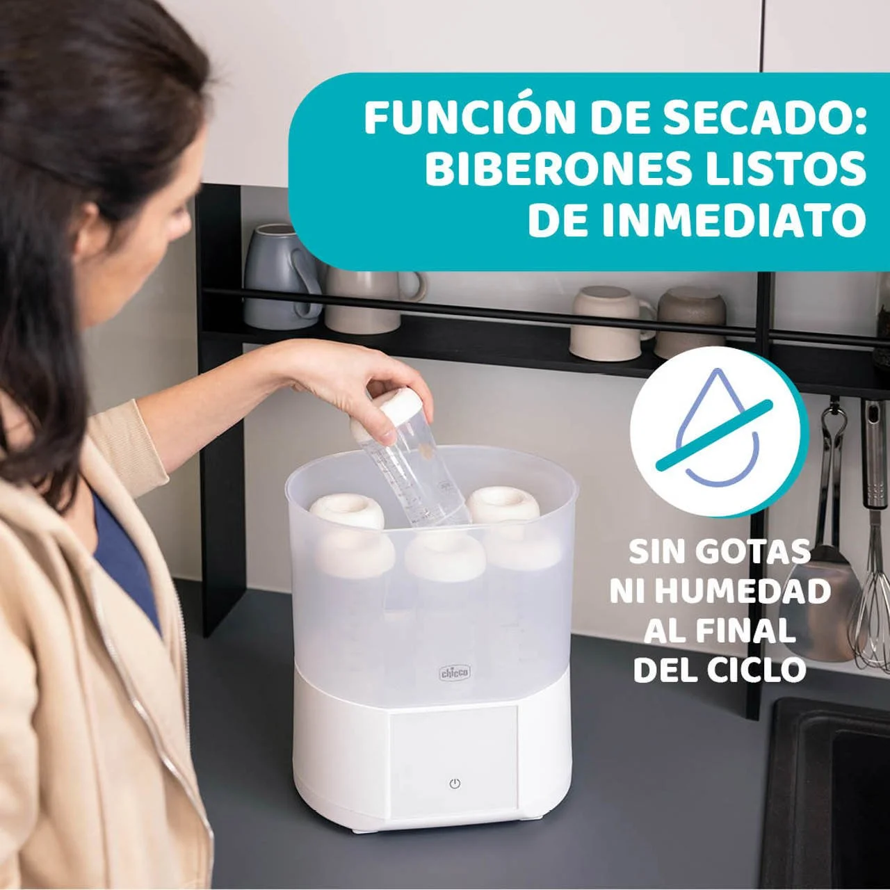 - ESTERILIZADOR CON SECADOR: Esteriliza y seca biberones y pequeños objetos del bebé de una forma rápida, y eficaz a través de un vapor natural, solo con agua.