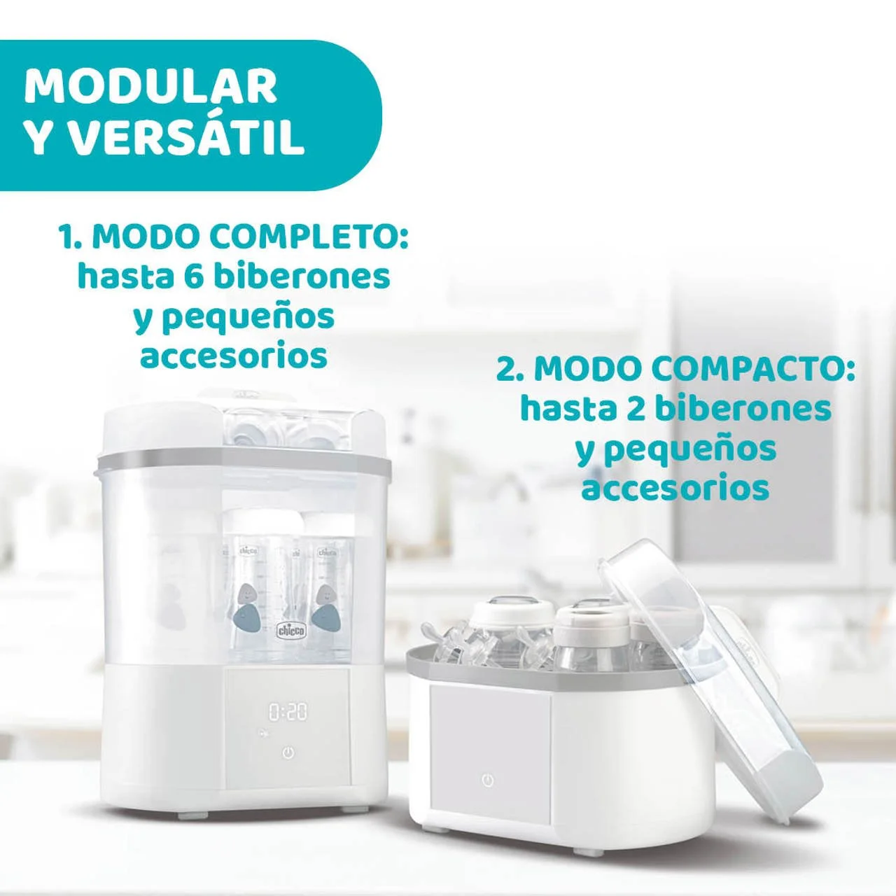 - MODULAR: Modo Completo (hasta 6 biberones y otros accesorios como chupetes); Modo Compacto (hasta 2 biberones, 1 sacaleches o chupetes).