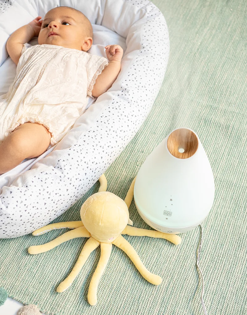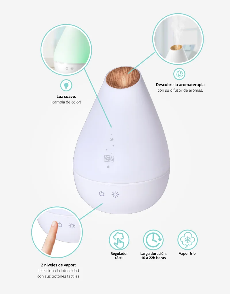 Este funcional humidificador protege la salud del bebé, ayudándole a respirar mejor. Regula el nivel de humedad para lograr un ambiente adecuado a las necesidades de niños y mayores. Genera un clima fresco y saludable que disfrutará toda la familia.