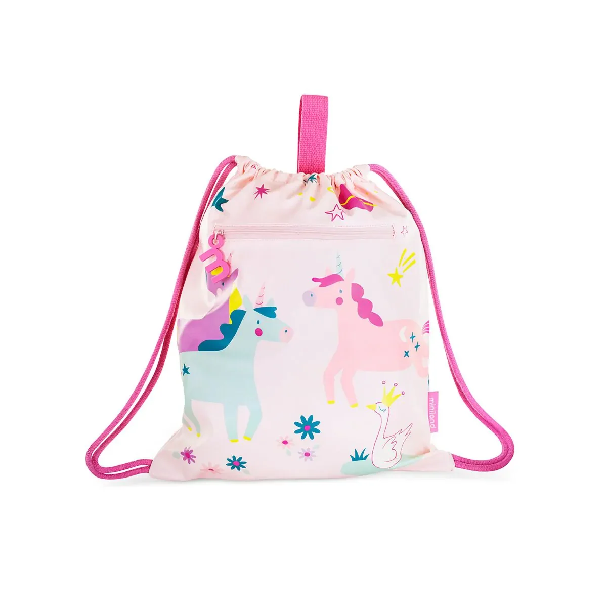 Descubre la mochila saco impermeables de Miniland, perfectas para las actividades diarias de los peques. Fabricadas en PU, cuentan con un amplio bolsillo principal impermeable y un bolsillo exterior para pequeños accesorios o juguetes. Incluyen asas de cordón ajustables y un asa superior para colgar fácilmente en percheros. Además, son personalizables con etiqueta para el nombre y lavables en lavadora (máx. 30ºC). Disponibles en divertidos diseños de unicornios, dinosaurios y animales de la jungla. ¡Funcionales y adorables!