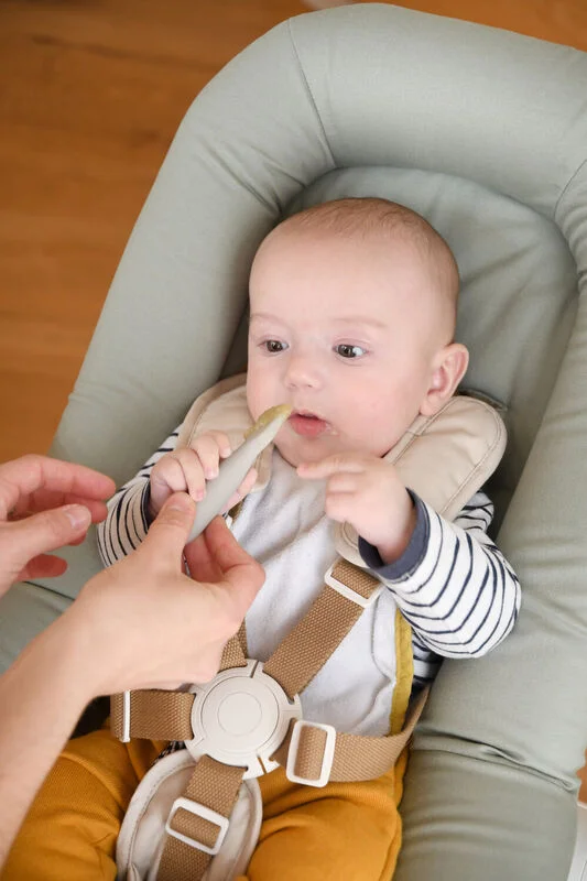 - Mango corto, redondeado y poco voluminoso: permite al bebé agarrar la cuchara de 3 maneras diferentes (con la palma de la mano, con la pinza o con el puño).