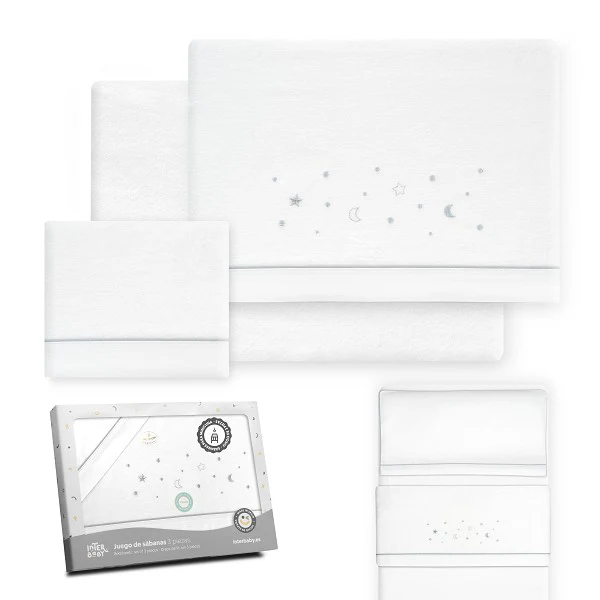 Juego de Minicuna con tejido de franela de la firma Interbaby. El juego está compuesto de 3 piezas. Tiene un tacto extra suave y gracias a su calidad una gran durabilidad.