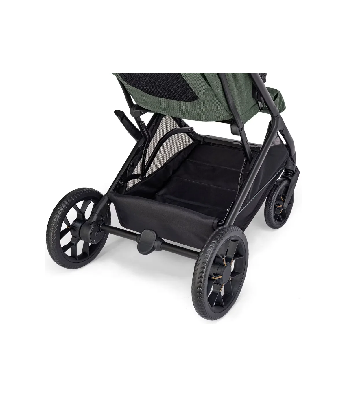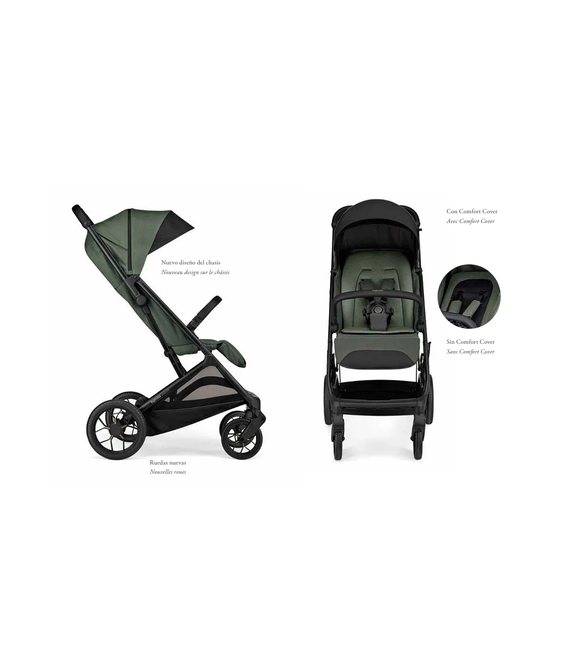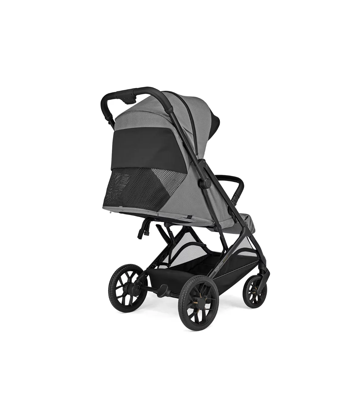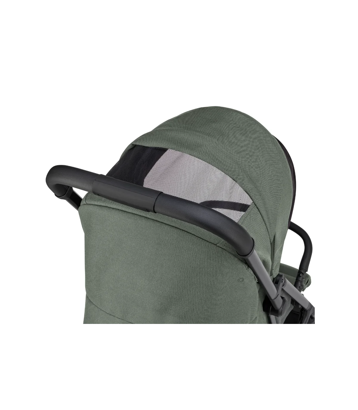 El cochecito se pliega fácilmente con una sola mano, incluso con la barra apoyabrazos montada, y se mantiene en posición vertical una vez cerrado. Para garantizar la máxima higiene, el manillar y la capota siempre permanecen elevados del suelo.