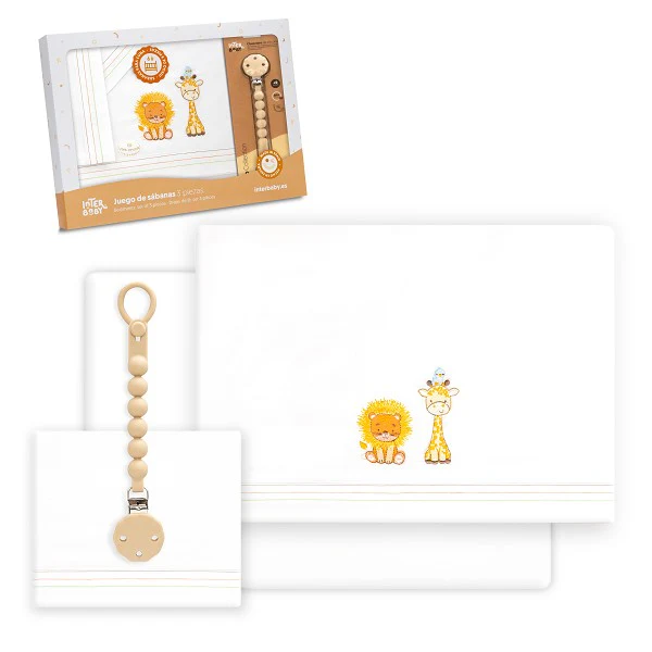Juego de sábanas de tres piezas confeccionado en algodón suaves y transpirables, perfectos para acunar al bebé mientras duerme. Incluye sábana bajera con elásticos ajustables, sábana encimera con detalle decorativo de la colección y funda de almohada. Con chupetero del mismo color incluido.