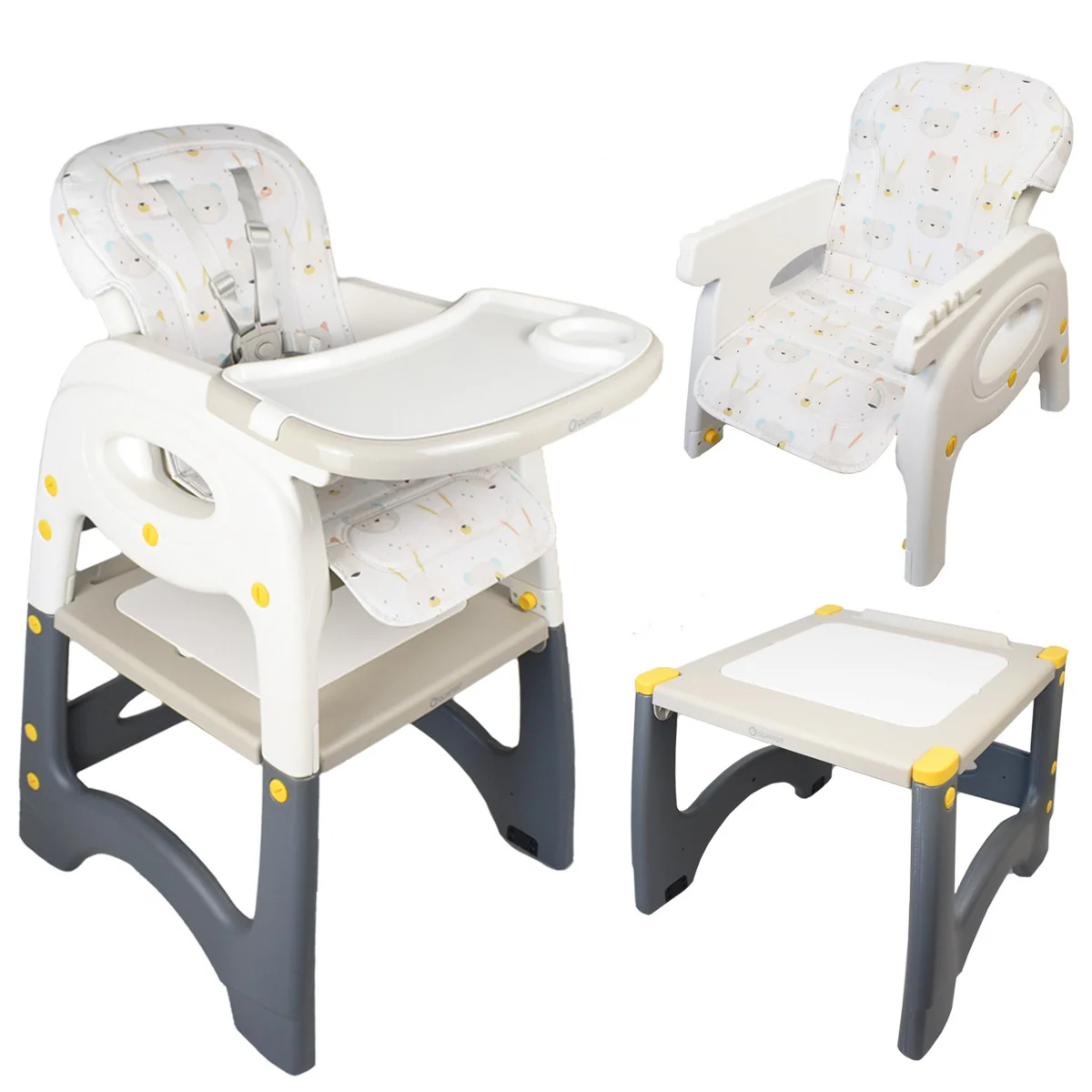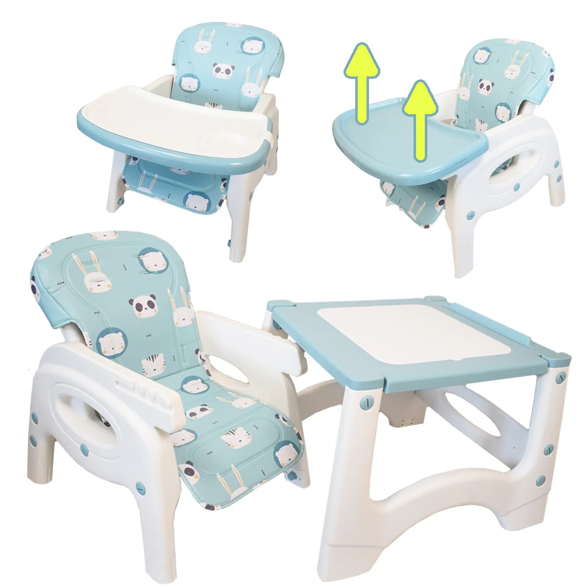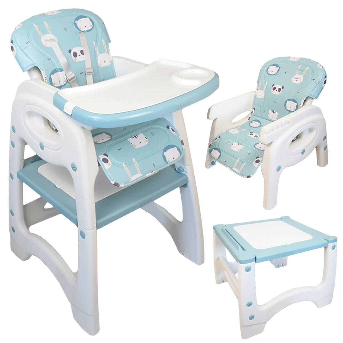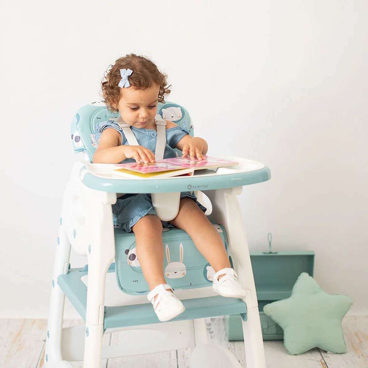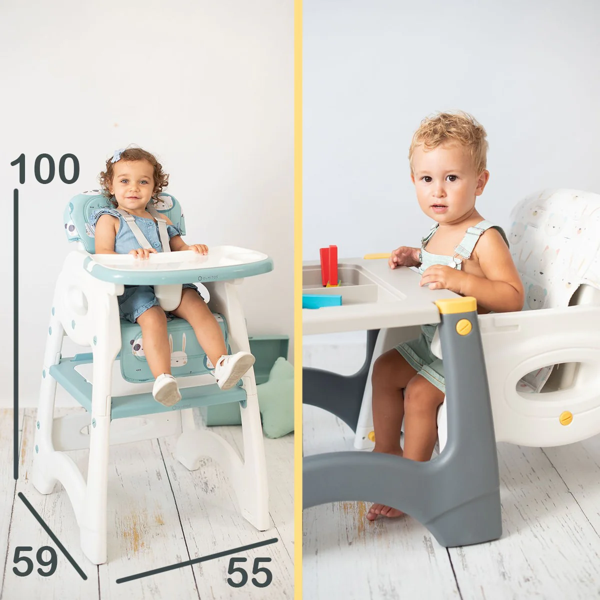 Trona de Plástico muy resistente, con amplio asiento y respaldo reclinable, arnés de seguridad de 5 puntos, doble bandeja extraíble y regulabe en 3 posiciones, barra de entrepierna para mayor seguridad. Tapiceria desenfundable desde los 6 meses hasta los 3 años. Mesa y Silla de 2 a 6 años